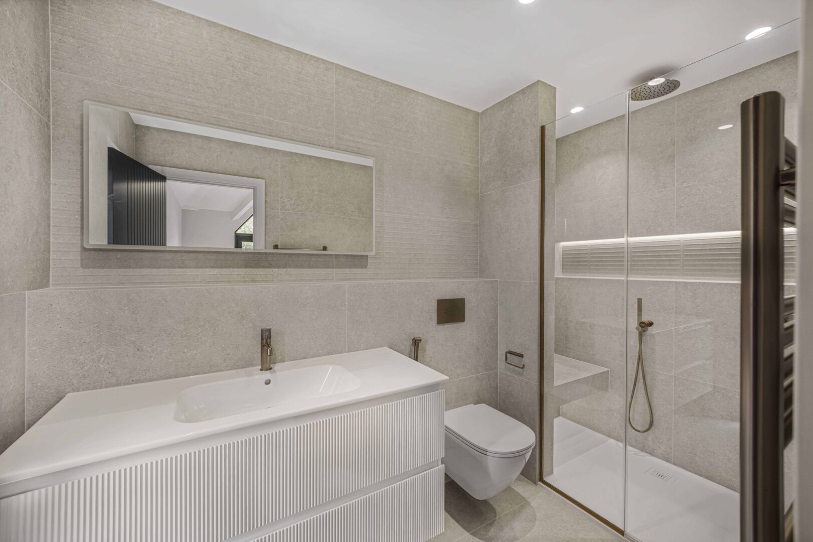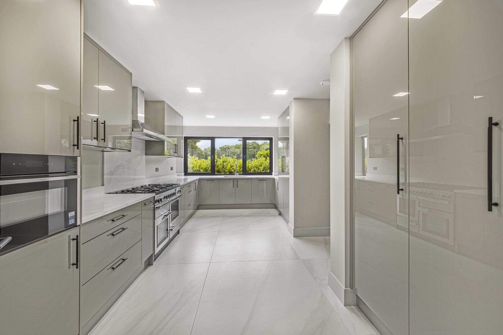 The property features two beautifully appointed kitchens, five large bedrooms each with its own ensuite, a dedicated utility room, boot room two large living rooms and an outbuilding providing additional living and working space. Throughout the home, large tiled floors and Crittall‑style doors creating a clean, contemporary aesthetic with a focus on durability and refined detail.